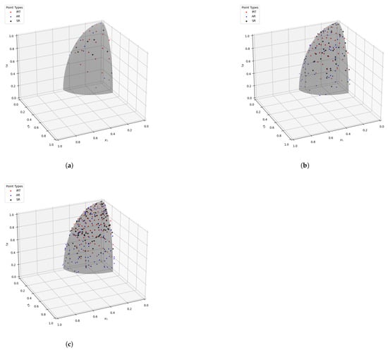 Using the modified good lattice point method to generate design points in , the corresponding design points on are obtained from Equations (15)–(17). The construction results are visualized in Figure 1, which shows the results of the IRT, AR, and SR methods for constructing a 10, 50, and 100-run uniform design on .