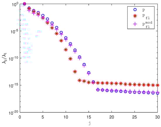 First, we examine the normalized eigenvalues (ratios to the largest eigenvalues) of the controllability Gramian P, the frequency-limited controllability Gramian , and its modified version , as shown in Figure 2. The Gramians P, and are accurately computed using MATLAB’s dlyap routine, while the matrix-valued function or is handled using the integral routine. Eigenvalues smaller than are discarded. As seen in the figure, the eigenvalues of decay slightly faster than those of P and , with their decay patterns being nearly identical. These results are consistent with the theoretical analysis presented in [], suggesting that the frequency-limited Gramians and can be effectively approximated using low-rank factors.