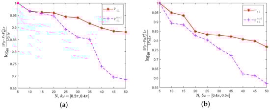 with respect to the truncation term N in the frequency intervals and , as shown in Figure 3. The results indicate an exponential decay in errors as the truncation term N increases. According to [], the orthogonal polynomials expansion of a Lebesgue-measurable function converges uniformly, leading to optimal least-squares error approximation. Therefore, even a modest order of approximation can yield high accuracy.
