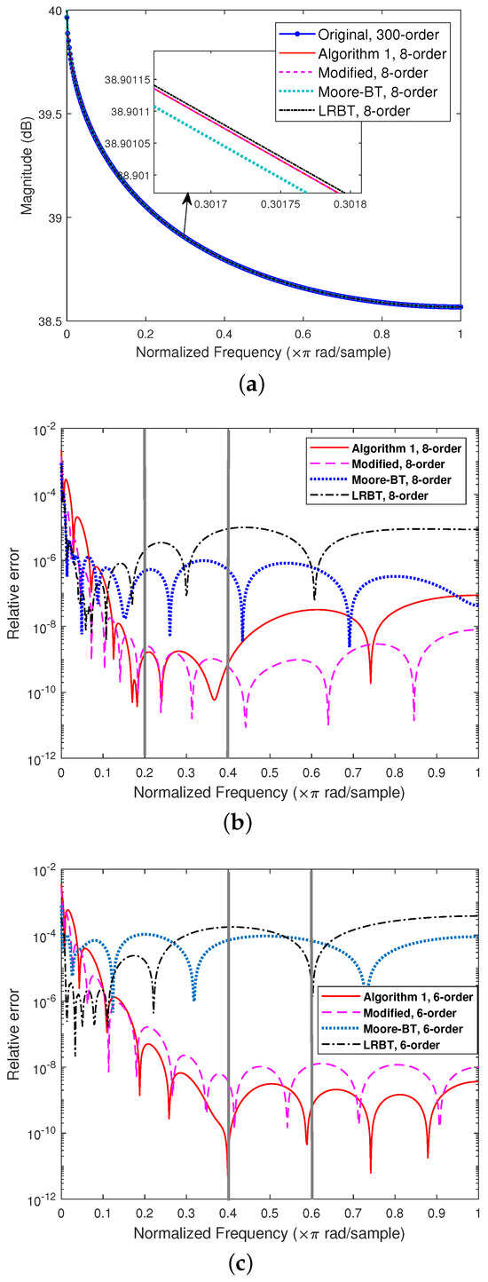 where and represent the transfer function matrices of the original system and the ROMs, respectively. The magnitude plots of , and the relative errors obtained using the MATLAB freqz routine are shown in Figure 4, with the frequency interval boundaries and indicated by thick vertical lines.