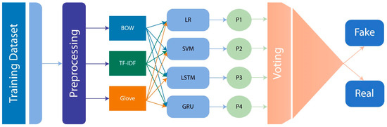 This paper aims to evaluate different classification methods in identifying fake news: logistic regression (LR) [13], support vector machine (SVM) [14], gated recurrent unit (GRU) [15], and long short-term memory (LSTM) networks [16]. To make the right decision about the input instance, we designed a weight voting model that synthesized the four classifiers, deciding the most appropriate output. The technical contributions of this study are as follows: