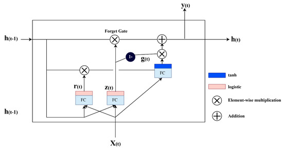 The GRU cell [15] can be considered a reduced version of the LSTM cell, but it may be better in some cases than LSTM. As can be seen from our experiments, both GRU and LSTM models are comparable in performance, but the GRU network trains much faster. The GRU contains two gate controllers that create the long-term and short-term states in one single vector, Notably, it holds true when = 1, where the forget gate is open and the input gate is closed; when = 0, the input gate is open and the forget gate is closed. This differs from the LSTM, which features an explicit output gate where the GRU cell just outputs in each step of time. The reset gate, , determines what from the previous state is sent through to the primary layer, . In GRU, key parameters like the number of units, dropout rate, optimizer, and learning rate are tuned to effectively model sequential dependencies, prevent overfitting, and enhance prediction accuracy. Figure 3 illustrates the architecture of the GRU cell and model, with the computations performed within the GRU cell detailed as follows: