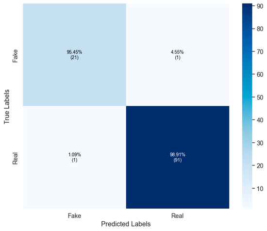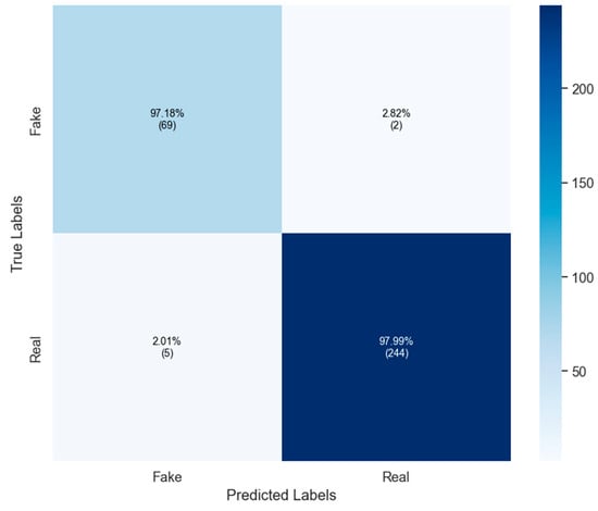 Table 6 shows the comparison of the different forms of ensemble techniques used in analyzing the BuzzFeed dataset. It is clear that among the assessed approaches, stacking shows relatively high results, an accuracy of 92.78%, precision of 92.14%, and F1-score of 92.03%, which proves that this method allows for enhancing the performance of several selected models. The analysis based on soft voting also shows good performance with an accuracy of 92.45%, precision of 91.86%, and F1-score of 91.98%. These methods yield lower performances; in bagging, the accuracy obtained is 91.54%, while boost obtains an accuracy of 89.67%. On the other hand, the proposed weighted-voting-based ensemble learning outperforms all other methods with an accuracy of 97.67%, precision of 96.98%, and F1 score of 97.14%. This impressive result demonstrates the model’s versatility in generating a reasonable fusion of predictions from other classifiers in the enrolment of fake news within the BuzzFeed set. Figure 5 illustrates the confusion matrix of the proposed model on the BuzzFeed dataset.