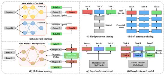 MTL enhances the learning efficiency of individual sub-tasks by leveraging shared information, ultimately leading to increased accuracy and operational efficiency. Figure 2 shows the differences between the training methodologies of various learning approaches. The success of MTL in improving forecasting performance is attributable to both the model’s inherent capabilities and the strategic optimization of the employed loss functions.