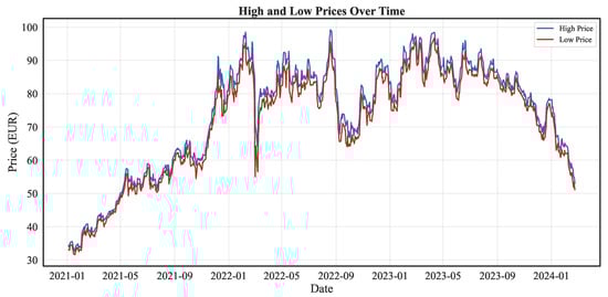 The main predictive variable selected is the interval-valued EUA futures prices expiring on December 24th, traded on the ICE CEX platform. The interval-valued EUA futures price data were sourced from the Investing database (https://www.investing.com/), encompassing the period from 4 January 2021, to 23 February 2024 (covering EU ETS Phase 4). As illustrated in Figure 3, the price data exhibit notable non-stationarity, non-linearity, and abrupt volatility, characteristics that necessitate careful modeling approaches.