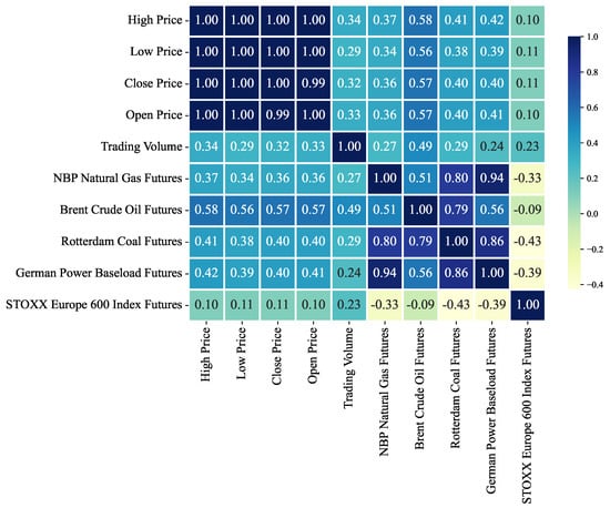 We conducted a Pearson correlation analysis to explore the relationships between the EU ETS allowance prices and related variables. The results as visualized in Figure 4 provide further insights into the interdependencies among the selected features. The heatmap reveals a strong correlation between the high, low, close, and open prices of the allowances, with coefficients close to 1, reflecting their inherent interdependence. Among the energy market variables, Brent crude oil futures exhibit the highest correlation with the allowance prices (e.g., 0.58 with high price), followed by Rotterdam coal futures and German power baseload futures, while NBP natural gas futures show slightly weaker correlations. These findings align with prior studies suggesting that energy prices significantly influence EU ETS price dynamics due to their direct connection to emission-intensive production processes. The trading volume also shows moderate correlations with the allowance prices, indicating its role as a potential indicator of market activity and liquidity. On the other hand, the STOXX Europe 600 index futures exhibit relatively weak correlations with the allowance prices, suggesting that financial market conditions may play a more indirect role in shaping the EU ETS dynamics.