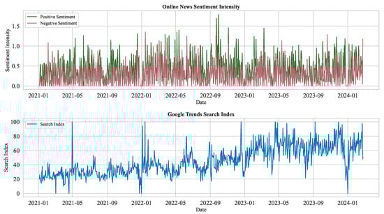 In addition to news articles, investors often leverage various search engines to explore topics of interest, and search indices reflect public attention levels toward specific subjects [64]. Google Trends provides real-time insights into search behaviors, enabling researchers to measure interest in specific topics across various locations and timeframes. The trends data are categorized by topics, offering a comprehensive perspective on search patterns, and also accommodate individual search terms, which are generally considered more reliable due to their inclusion of precise phrases, spelling variations, and acronyms across multiple languages. For this study, the topic “European Union Emissions Trading System” was selected as representative data for the search index, covering the period from 4 January 2021, to 23 February 2024, with data collected daily. The values of the search index are normalized on a scale from 1 to 100, rather than representing absolute search volumes. Figure 5 also depicts daily changes in attention data regarding the EU ETS over time.