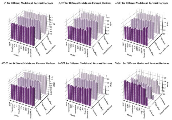 A more intuitive assessment of model performance is presented in Figure 6, which offers a 3D visual comparison of the predictive models across three forecasting horizons. As depicted, prediction accuracy generally declines as the forecasting horizon lengthens, consistent with typical patterns observed in time series forecasting.