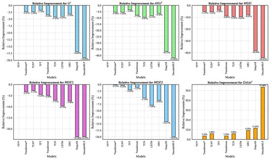 We further conducted a relative percentage improvement analysis to compare the TFT* model with the benchmark models within 1 day-ahead forecasting since it is the most crucial horizon for real-time decision-making in the carbon market. As shown in Figure 7, the proposed multi-task learning model demonstrates a consistent advantage in the accuracy of interval-valued predictions, such as showing a relative improvement of approximately 40% compared to DeepAR and DecoderMLP, particularly in and metrics. While the enhancement is somewhat reduced when compared to the multi-task learning Transformer* and TCN* models, it remains statistically vivid. In terms of , the TFT* model shows a relative improvement of 3.59% over multi-task and single-task Transformer, 5.89% over multi-task and single-task TCN, 9.30% over GRU, 11.63% over DeepAR, and 53.48% over DecoderMLP. Although its performance is comparable to that of single-task learning TFT and LSTM, TFT* achieves greater enhancements across other quantitative prediction standards.