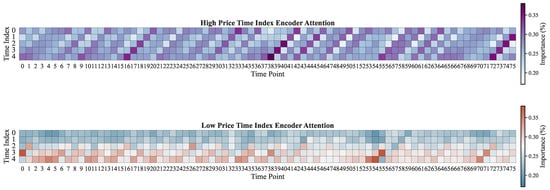 For high price predictions, the multi-task learning framework consistently allocated large attention to a specific trading day within certain weekly forecasting periods. The pattern indicates that the model identifies this day as a great influential index for predicting subsequent price peaks. Notably, this attention is persistently directed toward the same time index across multiple weeks. In contrast, for low price predictions, the model assigned higher attention weights to the three most recent trading days within the sliding window, suggesting that these time indices were critical for capturing the factors influencing minimum price predictions, with relatively lower attention allocated to earlier time steps.