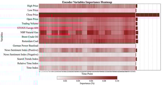 The analysis highlighted that the close price of carbon allowances was the most influential variable, accounting for over half of the total importance. The finding underscores the central role of the close price in the forecasting process, as it serves as a comprehensive indicator of market sentiment and daily performance, critical for generating accurate predictions. The second most important set of variables includes energy market factors, such as natural gas, coal, and crude oil prices. The energy inputs greatly impact the model’s predictions, reflecting the intrinsic link between energy prices and carbon costs, as fossil fuel combustion is a major source of emissions. The importance of energy prices in forecasting EUA futures prices has similarly been highlighted in interpretability analyses of the close prices prediction [7,89]. While the financial market variable (STOXX Europe 600 index), shows a secondary influence, it still provides contextual information that indirectly affects the allowance price forecasts. The financial market conditions affect investment flows and liquidity within the carbon market, making it crucial for risk managers to remain aware of the influences during periods of economic volatility. Salvagnin et al. [77] pointed out that during the transition of the EU ETS to Phase IV, the influence of financial market volatility appeared to take a central role. Regarding the EUA futures high-open–low-close price data and trading volume, the analysis reveals that the open price and trading volume are more influential in the forecasting process than the high and low prices. This suggests that early trading signals and overall market activity provide more reliable information for predicting price movements. Lastly, online news sentiment intensity and the search index demonstrates that these variables contribute to the prediction, albeit with slightly less importance than market-related data. Positive news sentiment exerts a stronger influence on predictions than negative sentiment, reflecting the market’s tendency to respond more importantly to optimistic developments.
