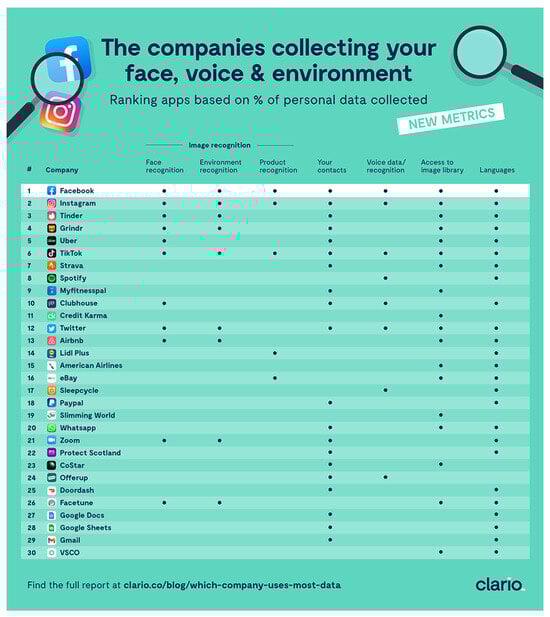 - Slynchuk, A. Big Brother Brands Report: Which Companies Access Our Personal Data the Most? 2022. Available online: https://clario.co/blog/which-company-uses-most-data/ (accessed on 1 December 2024).