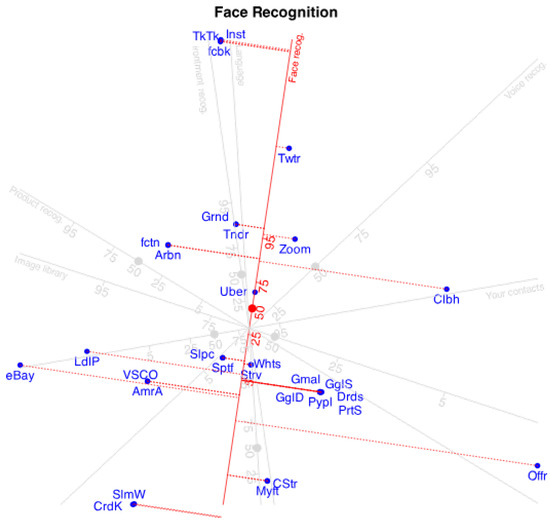 - Gower, J.C.; Hand, D.J. Biplots; Chapman & Hall/CRC Monographs on Statistics & Applied Probability; Taylor & Francis: Abingdon, UK, 1995. [Google Scholar]