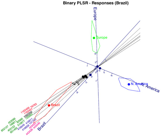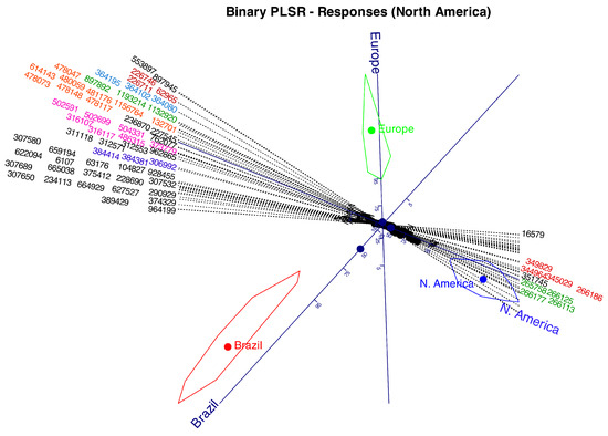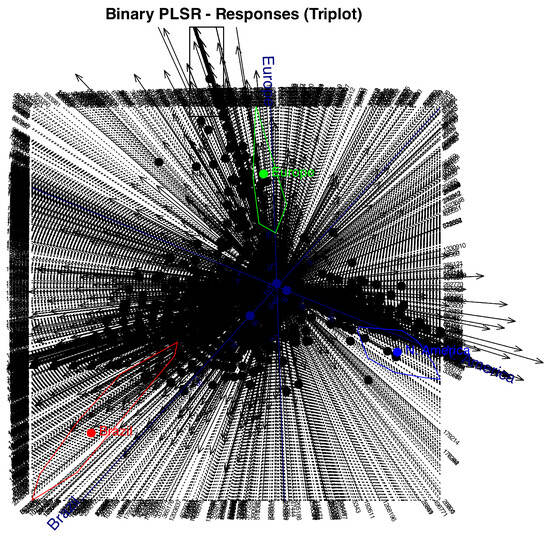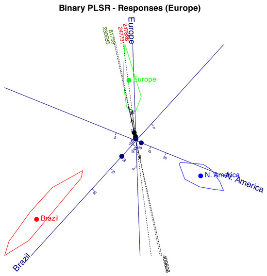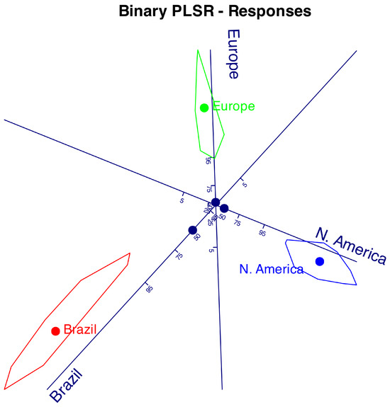 Biplots were initially proposed in connection to PCA [4] but have been used also accompanying other techniques as Multivariate Analysis of Variance (MANOVA) [5,41], Correspondence Analysis [42] among many others. In the context of PLS for continuous data, it is clear that Equations (1) and (2) define a biplot. The properties of those representations can be developed by Oyedele and Lubbe [14] and Vicente-Gonzalez and Vicente-Villardon [15].