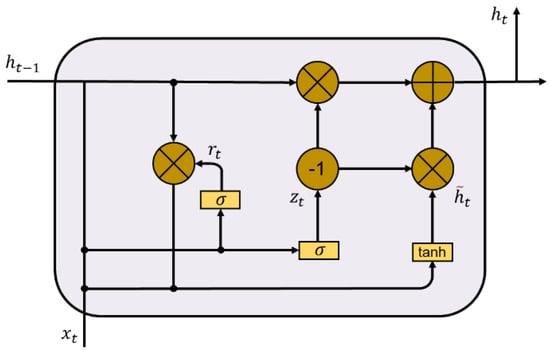 The GRU, an improved algorithm based on LSTM, has a simple structure and can also avoid the long dependence problem [54]. Figure 1 illustrates the internal architecture of the GRU, which comprises an update gate and a reset gate. The update gate regulates the number of historical data retained at the current time step, while the reset gate controls the extent to which previous information is disregarded.