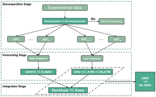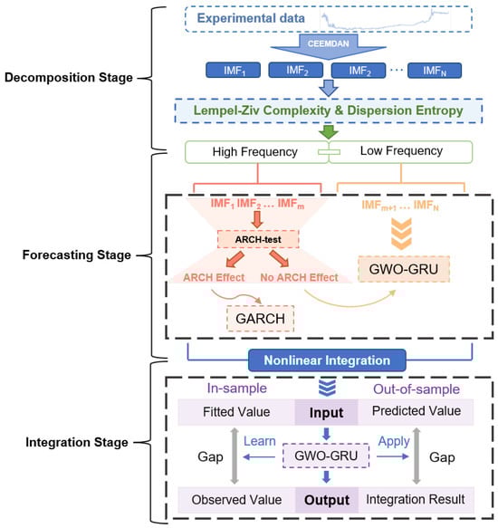 This paper combines CEEMDAN, GARCH, and GWO for hyperparameter optimization to propose a nonlinear decomposition-integration framework named CEEMDAN-GWO-GRU/GARCH-GRU. The model construction process mainly includes three stages, as shown in Figure 2.