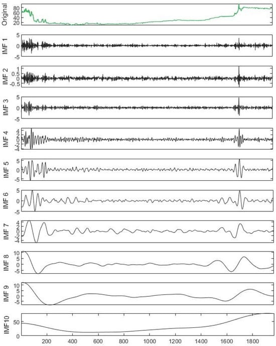 Adaptive noise-complete ensemble empirical modal decomposition (CEEMDAN) comprises a noise-assisted decomposition algorithm designed to overcome the limitations of empirical modal decomposition (EMD) [50] and ensemble empirical modal decomposition (EEMD) [21] regarding mode aliasing and the effects of white noise. Its primary objective is to more effectively address high-frequency noise and the non-stationary characteristics present in signals.