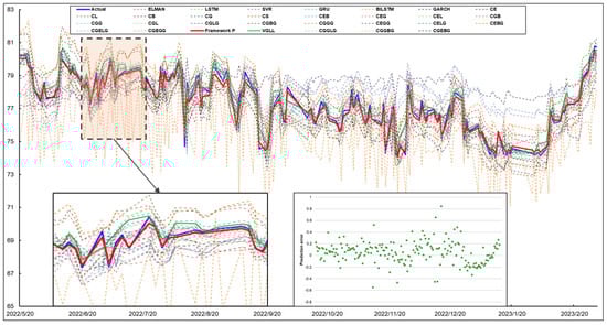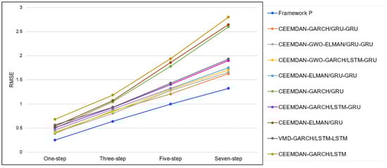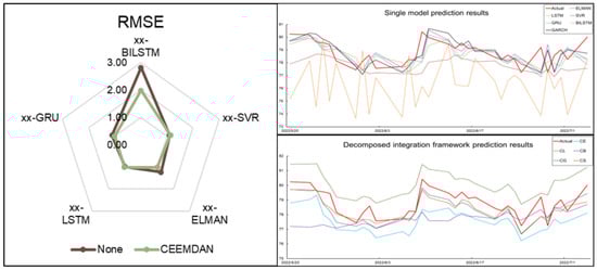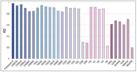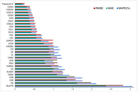 This paper compares various forecasting models and frameworks to verify their accuracy and validity. Three common loss functions, RMSE, MAE, and MAPE, are used to evaluate the model. Compared with a single evaluation indicator, applying three different evaluation indicators can obtain a more objective and comprehensive model and framework. Their definitions are shown as Formulas (24)–(26), where and represent the real value and predictive value of the test set at the moment t, and n is the sample size of the test set. The three evaluation indicators reflect the errors between the predictive and real values from different perspectives. The smaller the value of the evaluation indicators, the better and more reliable the prediction effect of the models and frameworks.