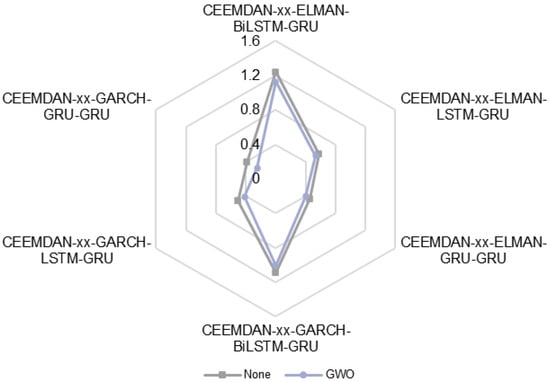 (2) Unlike studies that rely solely on econometric models or machine learning methods for forecasting, the new decomposition-integration framework proposed in this paper effectively combines the strengths of both econometric models and machine learning methods to optimize predictions of different frequency components. The GARCH model is used to forecast high-frequency components, which leverages its strength in capturing volatility clustering in high-frequency data. For low-frequency components, the framework employs a GWO-optimized GRU model, which effectively integrates the GRU’s ability to handle long-term dependencies with GWO’s global optimization capabilities. This effective fusion of econometric models and machine learning methods enables the model to accurately capture the different frequency characteristics of carbon price data, thereby enhancing overall forecasting performance.