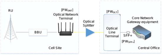 It can be assumed that each RU in the 5G network has an optical network terminal (ONT) that links to a single optical line terminal (OLT) in order to assess the power consumption of the GPON/NGPON backhaul. The fact that PON is a point-to-multipoint technology with a physical range of up to 60 km lends credence to this [38]. Equation (2) can be modified as follows to determine the backhaul power usage, utilizing the configuration shown in Figure 2: