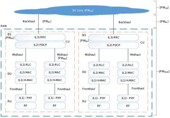 Power utilized by the DU, PWDU, may be calculated using Equation (1), which additionally accounts for the power consumption by the RU and front link. Therefore, a generalized equation for the overall power used by the RAN can be evaluated as follows: