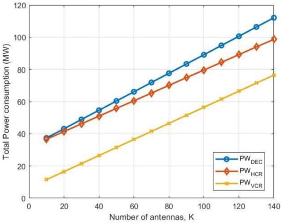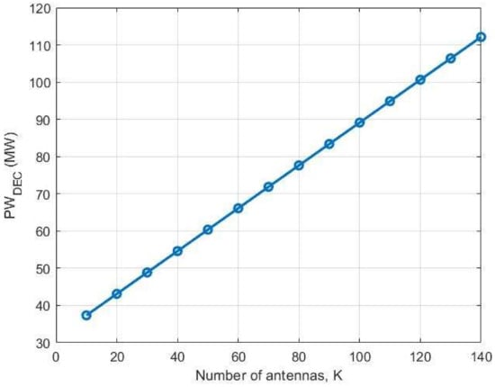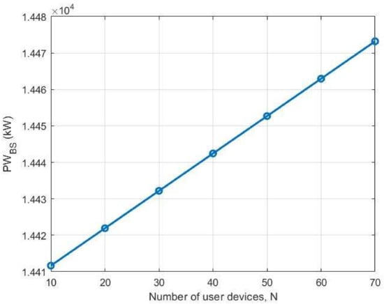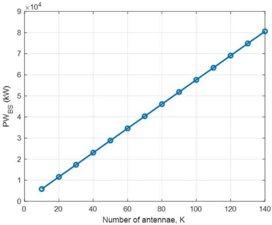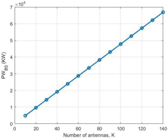 Figure 6 shows that the PWBS rises approximately linearly as the number of antennae increases. When 140 antennae are installed, the consumption peaks at 80 kW, with an average increase of about 600 kW for each new antenna. The results for the PWBS change with respect to N are likewise shown in Figure 7. Notably, 115 active antennae were deemed sufficient based on the presumptions and standard values in [9,41]. A maximum cell radius of 500 m and the uniform distribution of users within a radius of 35 m from the cell core are two crucial model assumptions.