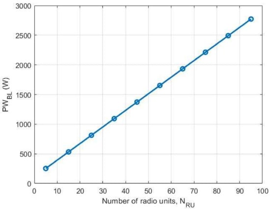 where is the number of RUs, is the network gateway switch’s power usage, and the remaining parameters are described in Equation (2). Since heterogeneous and ultra-dense networks are key technical enablers for 5G, it is imperative to investigate how RU deployment impacts the end-to-end power consumption of 5G networks [35]. Figure 8 illustrates how the backhaul’s power usage varies with the number of RUs, as noted in [15]. It shows that the power loss coefficient (PWBL) grows almost linearly with the 5G network’s RU count, rising by around 20 W per RU on average.
