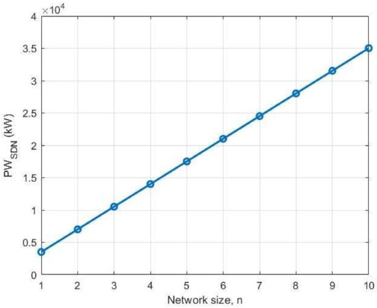 where PWcj is the power consumption of the controllers, PWsj is the power consumption of the switches, PWElk is the power consumed by the ethernet links, n represents the total number of network elements, including switches, controllers, and latency queues, L represents the packets queued due to latency, and z1, z2, and z3 are the constants derived from the simulation based on the policy decisions of the SDN controller.