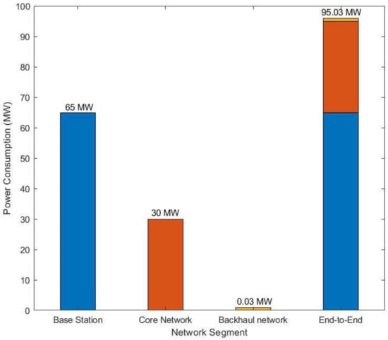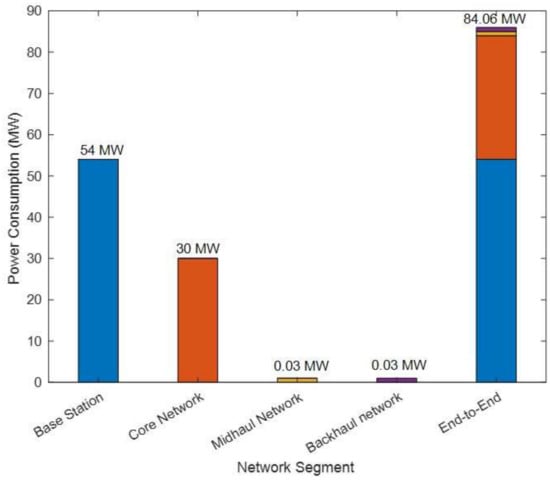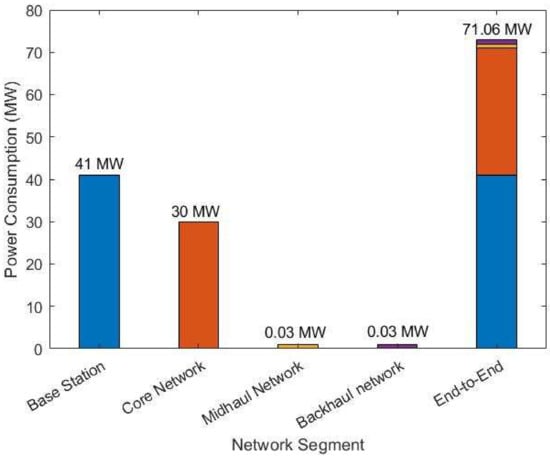 There are a number of gaps in the body of knowledge about 5G networks’ power consumption. The majority of studies have concentrated on the amount of power used in a single 5G network section. For example, different models of power consumption for 5G BSs and mid-haul links based on mMIMO (massive multiple-input multiple-output) were examined by [4,8,9]. Ref. [10] developed models for the power usage in virtualized RAN settings, offering an alternative viewpoint. By concentrating on software-defined networking (SDN) technology, [11,12,13,14] investigated various strategies to optimize energy consumption at the core network level. However, [15] compared various backhaul communication architectures based on their power consumption models. On the other hand, the authors are unaware of any previous studies that have attempted to calculate the end-to-end power consumption of 5G networks by aggregating the power consumption at various 5G network segments. Also, much of the previous research has only looked at one or two particular 5G network topologies. Therefore, studies comparing the end-to-end power consumption of various 5G network topologies, both centralized and decentralized, are currently lacking.