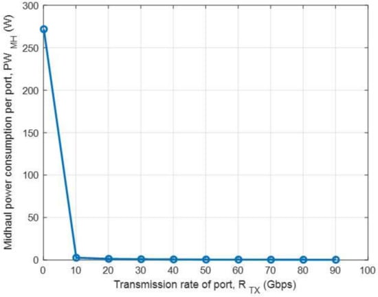 where is the constant power usage in each RU, is the mean quantity of user devices (UDs) connected to each RU, is the upper threshold for the power amplifier’s power, and is the factor for direct current to radio frequency conversion. Presumably, is estimated similarly as for the C-RAN scenario. Also, since it represents the power consumption of mid-haul links between the remote sites and central sites, the end-to-end power usage for a 5G Cloud C-RAN, PWVCR, can be evaluated as follows: