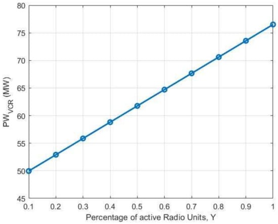 where represents the active mode power consumption of the RUs, Y is the proportion of active RUs expressed as a percentage, is the sleep mode power consumption of the RUs. can be derived as follows: