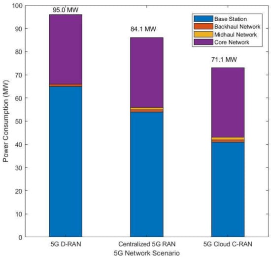 The experiments and simulations conducted revealed that the 5G decentralized scenario exhibited the highest energy consumption. In contrast, the centralized 5G RAN and 5G Cloud C-RAN scenarios consumed 9% and 15% less power, respectively, compared to the decentralized scenario. The study also demonstrated that BSs generally accounted for approximately 74% to 78% of the total power consumption in 5G networks.
