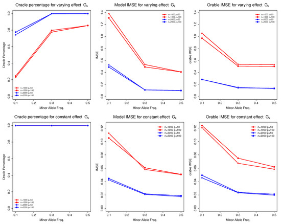 Since h represents the order of the B-spline basis function, higher degrees introduce more complex interactions and collinearity between environmental factors and genetic predictors. We search for the optimal h in the set h { 2 , 3 , 4 } . For K, only when K = O p ( n 1 2 r + 1 ) (where n is the sample size, r is the smoothness of m k ( . ) , and r > 2 ), the selection approach achieves oracle properties. We therefore search for the optimal K in the neighborhood of n 1 2 r + 1 , denoted by K . In our simulations, K = { 2 , 3 , 4 , 5 } .