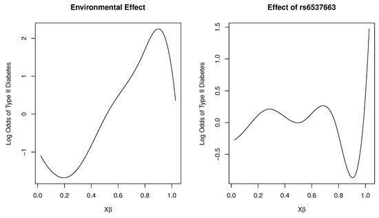 where Y n × 1 = ( Y 1 , Y 2 , , Y n ) T represents the binary response variable, and n denotes the sample size. The set { m k ( . ) } k = 0 , 1 , , p comprises p + 1 unknown real-valued continuous functions. X n × q = ( X 1 , X 2 , , X q ) contains environmental variables, and β q × 1 = ( β 1 , , β q ) T represents the loading parameters of the model. G n × ( p + 1 ) = ( G 0 , G 1 , , G p ) where G 0 = ( 1 , , 1 ) T and G k = ( G 1 k , G 2 k , , G n k ) T is a continuous or discrete vector of length n for k = 1 , 2 , p . Consequently, for k 0 , m k ( X β ) represents the effect of G k on Y on a log-odds scale, while m 0 ( X β ) serves as the intercept term.
