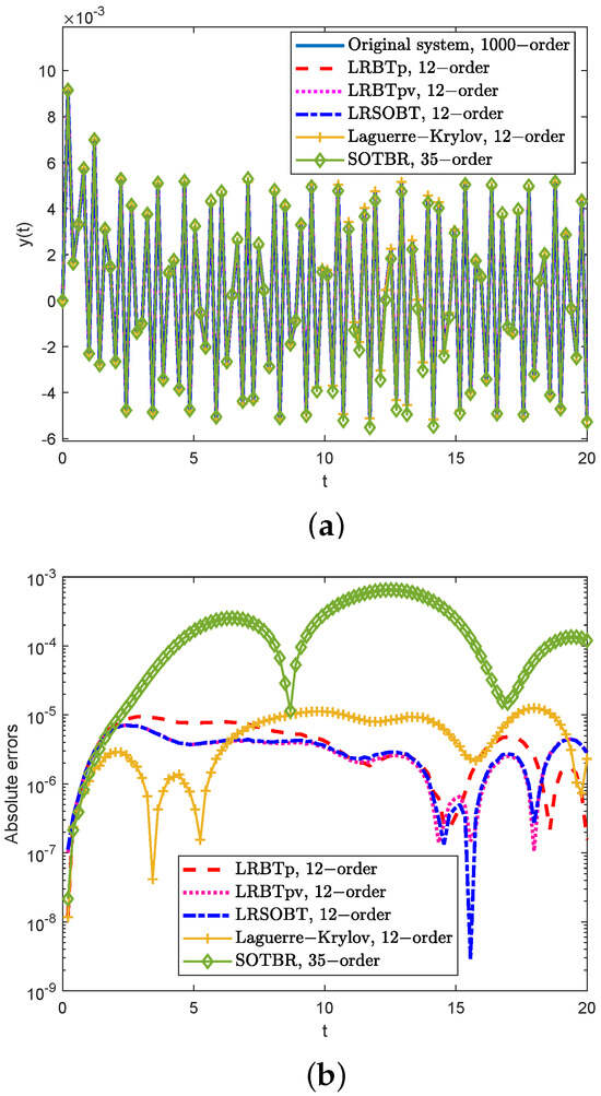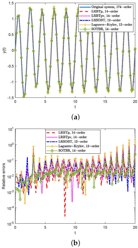 For this example, the parameters in Algorithm 1 (LRBTp), Algorithm 2 (LRBTpv), and Algorithm 3 (LRSOBT) were configured with , , and the Laguerre parameter (also for the Laguerre–Krylov approach). The adaptive order r of the reduced model determined by Algorithm 1 (LRBTp) and Algorithm 2 (LRBTpv) was 14. The adaptive order r of the reduced model determined by Algorithm 3 (LRSOBT) was 12. We set the orders of the ROMs generated through the Laguerre–Krylov method and SOTBR method to 12 and 14. Furthermore, to evaluate the approximation quality of the generated ROMs, the relative errors of their output responses are displayed: