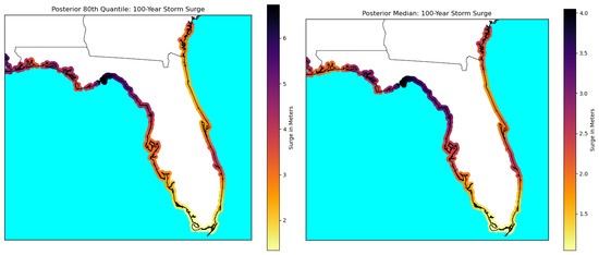(Left): The 80th percentile upper bound for 100-year storm surges based on data from 1979 to 2019. (Right): Posterior median for the same.