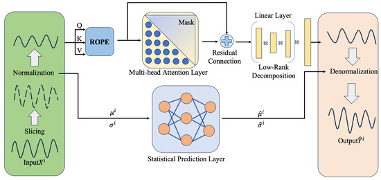Furthermore, time series models are influenced by concept drift. The ALD model makes improvements to the idea from the SAN model, where a separate network is employed to learn changes in the data distribution. Through the incorporation of low-rank decomposition, the ALD model decreases the space needed for storing and transmitting data. Low-rank decomposition decomposes a large matrix into two smaller matrices of lower ranks, enabling the original data to be approximately represented with less storage space and enhancing computational efficiency. The fundamental structure of the ALD model mainly comprises a decoder layer and a statistical forecasting layer, as depicted in Figure 1.