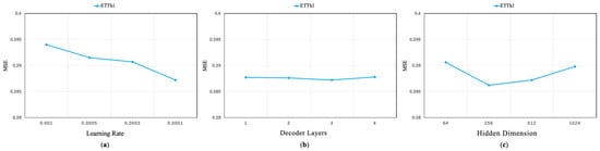 We assessed the hyperparameter sensitivity of the ALD model in accordance with the following factors: learning rate, the number of decoder layers, and hidden layer dimensions. The results are presented in Figure 2 and Figure 3. The results are documented with an input length of 96 and a forecasting window length of 96. On both the ETT and exchange rate datasets, it was found that the model achieved the best performance with a learning rate of 0.0001, three decoder layers, and a hidden layer dimension of 512. In the ALD model, augmenting the number of decoder layers and hidden dimensions did not inevitably enhance the model’s performance.
