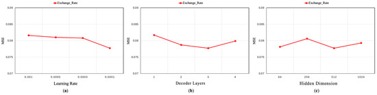 Hyperparameter sensitivity on the exchange rate dataset. (a) learning rate; (b) decoder layers; (c) hidden dimension.