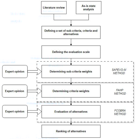 This research introduces a novel hybrid MCDM model designed to address the ranking and selection of MHE. The proposed model integrates the SAPEVO-M [36], FAHP [47], and FCOBRA methods [44]. The SAPEVO-M method is utilized to determine the weights of sub-criteria. Next, the FAHP method is applied to compare criteria and consolidate their weights. Finally, the FCOBRA method is used to rank the alternatives. The incorporation of methods developed within a fuzzy environment makes this model particularly suited for imprecise data, interval grades, and other uncertainties often encountered in decision-making processes. Figure 1 presents a flowchart of the methodology, providing a clear and concise overview of the steps involved in the application of the SAPEVO-M, FAHP, and FCOBRA methods. The diagram illustrates the key stages of the process, from problem definition to the evaluation and ranking of alternatives.