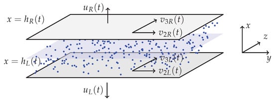 where the first components of the velocity vectors govern the dynamics of the moving boundaries. If the velocity is prescribed, the positions of the boundaries can be determined by solving (12), with the initial conditions and . The described flow configuration is schematically presented in Figure 1. We assume the following homogenous boundary conditions for the microrotation field and the heat flux: