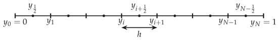 Let h denote an increment in y such that for the chosen number of discretization points, . The staggered grid points (Figure 2) are denoted by , , and , .