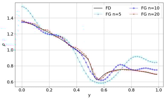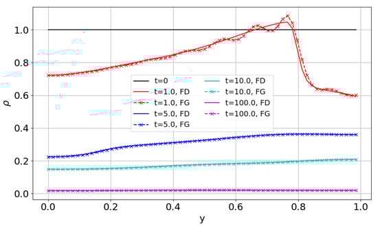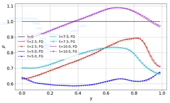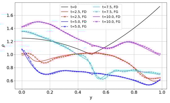 In this example, the chosen initial function for the density had lower smoothness and the Fourier expansions of the initial functions contained an infinite number of terms, in contrast to the Fourier expansion of the initial conditions in Example 1, which only had one term in the expansion. The aim of this example was to investigate the influence of the number of expansion terms on the computational results and to compare the methods in the case of less smooth initial conditions. In the finite difference scheme, a spatial discretization with cells was used, while in the Faedo–Galerkin method, we employed terms in the approximate functions. As before, the time step was set to .