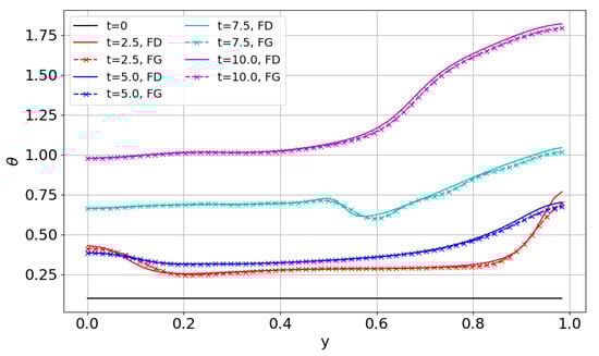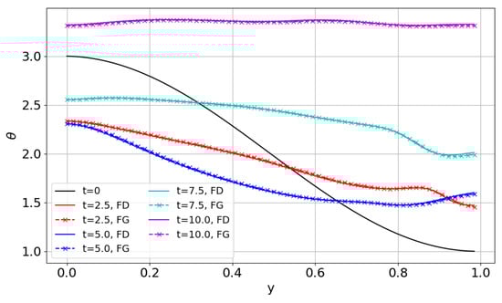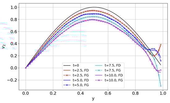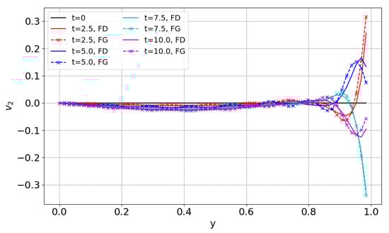 The aim is to analyze the solutions in the presence of non-homogeneous boundary conditions and to compare the proposed computational approaches. For clearer visualization and comparison, the solutions in Figure 3, Figure 4, Figure 5 and Figure 6 are shown in mass Lagrangian coordinates, that is, they are displayed in a fixed domain. The numerical solutions obtained with both methods for the selected moments in time are compared. It can be observed that the solutions generally agree well. However, in the case of the Faedo–Galerkin method, minor oscillations occurred in the solution, which is particularly evident in Figure 6. Of course, the intensity of these oscillations decreased as more terms were included in the Faedo–Galerkin approximation.