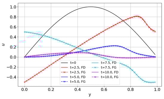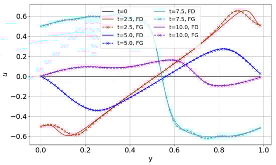 Example 1.B: a comparison of the numerical results obtained by the finite difference and the Faedo–Galerkin method at different moments in time. Velocity—u.