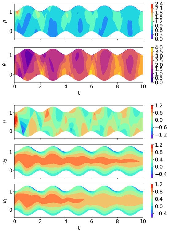 To better illustrate the influence of non-homogeneous boundary conditions on the solutions, Figure 7 shows the temporal evolution of the solution using contour plots in Eulerian coordinates. Since the simulation was performed in mass Lagrangian coordinates, it was necessary to track the evolution of the domain points by applying Equation (20), that is, by solving the corresponding differential equation . This visualization clearly shows both the change in the domain over time and the corresponding changes in the solution values.