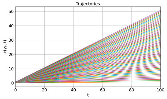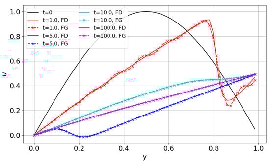 The evolution of the problem domain can be observed in Figure 8, which shows the trajectories of the discretization points used in the finite difference method. The trajectories corresponding to and define, in fact, the boundaries of the domain at each moment in time. The solutions obtained for this case are shown in Figure 9 and Figure 10, where the numerical results for and u from both methods are compared for the selected moments in time. For clarity, the solutions are again shown in mass Lagrangian coordinates in a fixed domain. Since the boundary conditions were set such that for the velocity of the upper plate remained constant at , while the lower plate remained fixed, it was physically justified to expect the solutions to converge to a steady state. It can be observed that the density decreased and converged to zero, which was expected as the mass was conserved, while the domain expanded with time. Moreover, since the velocity was 0 for the bottom plate and for the upper plate, the velocity u clearly converged to a linear profile within the domain, as can be seen from the solution at .