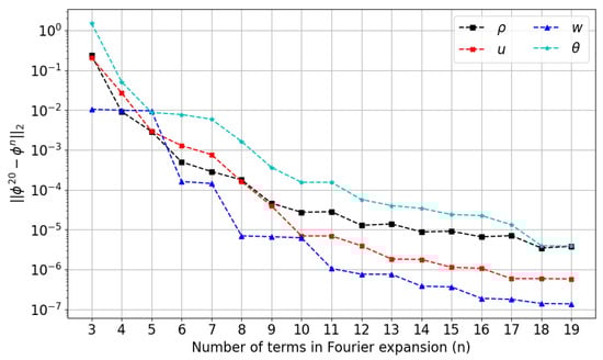 We examined first the convergence of the Faedo–Galerkin method with respect to the number of terms in the Fourier expansion. Specifically, we computed the -norm of the difference between the reference solution and the approximate solutions obtained with varying numbers of terms in the expansion. The results, presented in Figure 11, demonstrate a clear convergence trend toward the reference solution. Although this is not a strict proof of the convergence rate, the trend is obvious.