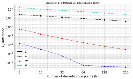 A similar approach was employed to assess the convergence properties of the finite difference method. We used the same reference solution as before, namely the one obtained using the Faedo–Galerkin method with . We then computed the -norm of the difference between this reference solution and the solutions obtained using the finite difference method on grids with different numbers of discretization points, N. In this case, the deviations were measured only at the discretization points. The analysis was performed for N = 8, 16, 32, 64, 128, and 256 discretization points, where the time step was chosen to be sufficiently small to ensure numerical stability. The results are shown in Figure 12 on logarithmic scale. They clearly illustrate that the solutions converged as the number of the discretization points increased.