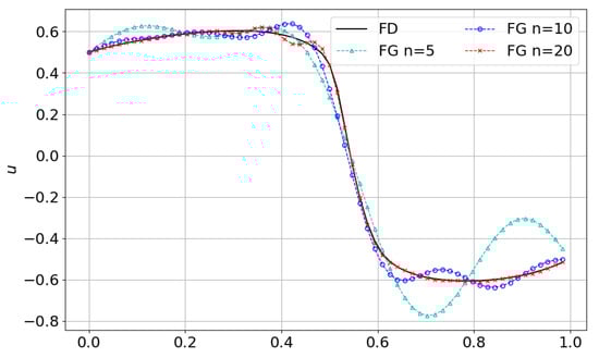 We also investigated how the number of Fourier series terms in the Faedo–Galerkin method affected the solution near such problematic points. The results at s are shown in Figure 17 and Figure 18. As observed in the previous figures, the presence of steep gradients or non-smooth solutions leads to oscillations in the Faedo–Galerkin method. This effect is particularly noticeable when fewer expansion terms were used. However, as the number of terms increased, the numerical solutions obtained with the Faedo–Galerkin method progressively approached those obtained by the finite difference method.